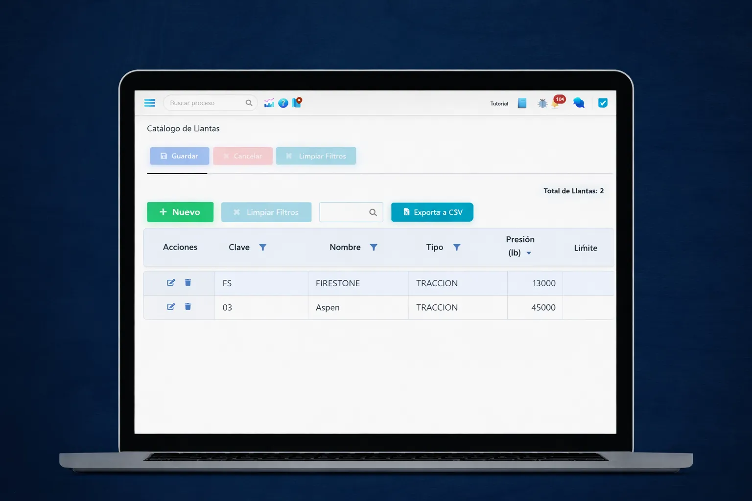 Módulo con interfaz gráfica que permite controlar la administración de las llantas, recibe alertas y crea rutinas por desgaste para realizar procesos de cambio, reubicación, rotación, etc.