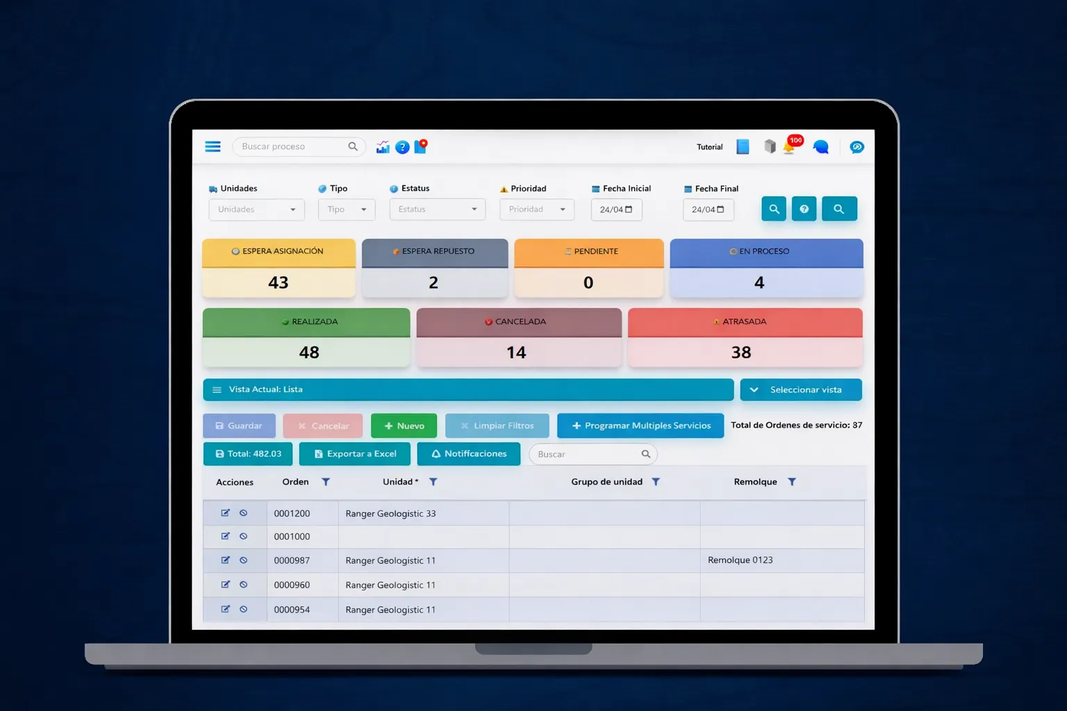 Administra o controla todos los servicios, refacciones y herramientas generando órdenes que incluyen ciertos parámetros y frecuencias.