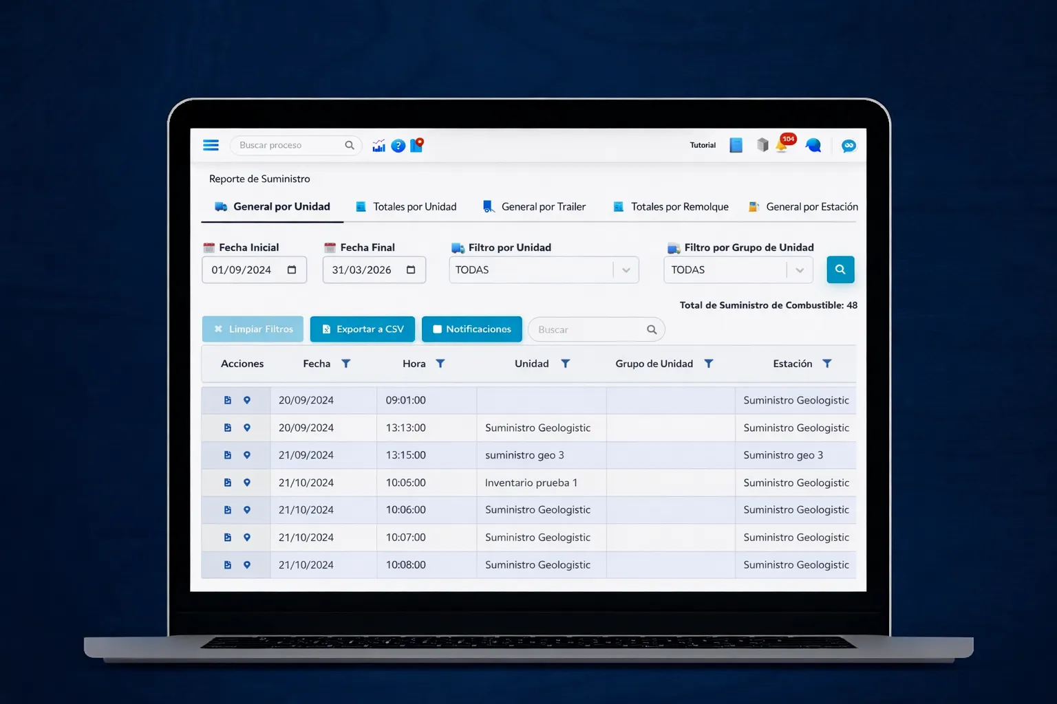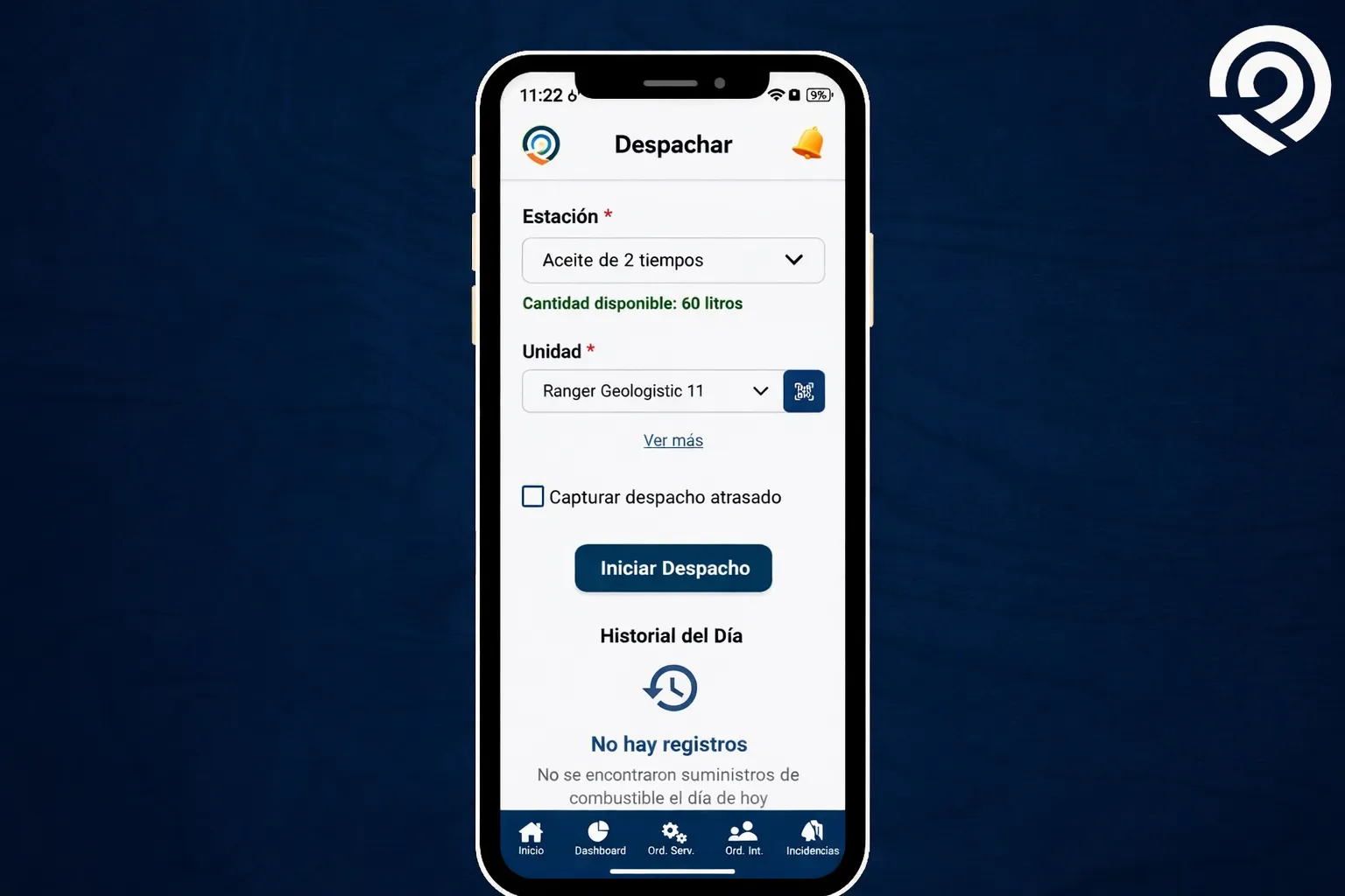 Registra o importa las cargas de combustible, permite utilizar estaciones internas, comerciales y el uso de cinchos (sellos de seguridad) con procesos automatizados por lectura de códigos de barra o QR.