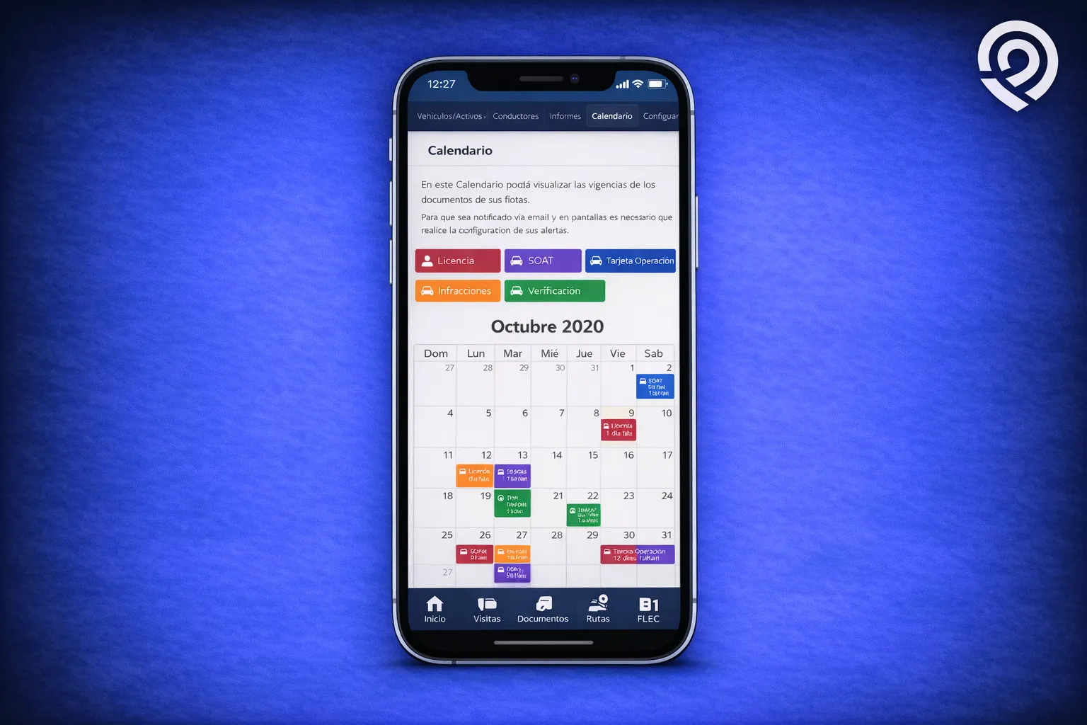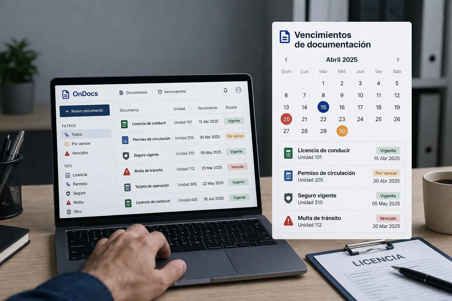 OnDocs le permite gestionar en una vista tipo calendario, todos los vencimientos de los documentos importantes para las flotas, como licencias, permisos o multas, por ejemplo.