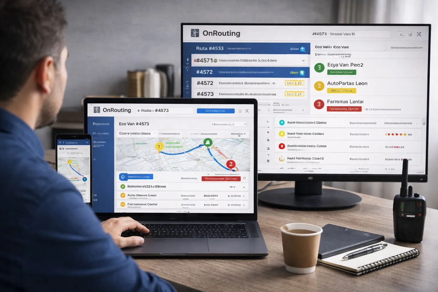 OnRouting le ayuda a planear y programar las rutas diarias y el despacho de activos, con paradas o puntos de paso, horarios, tolerancias y seguimiento de cada ruta.